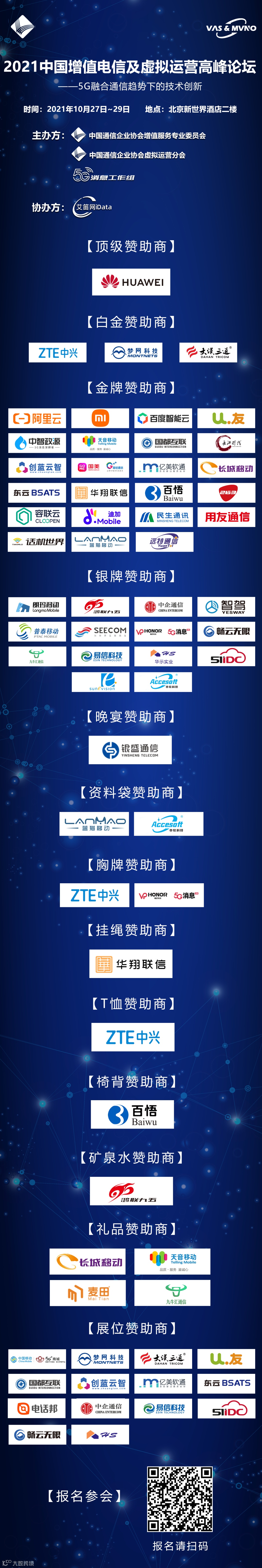 为了加快基础电信企业、增值电信企业和虚拟运营企业的融合发展,大力推进5G应用创新,繁荣5G生态,促进国际合作,凝聚共同发展的动力,中国通信企业协会增值服务专业委员会、虚拟运营分会和5G消息工作组定于2021年10月27-29日在北京新世界酒店主办“2021中国增值电信及虚拟运营高峰论坛”。