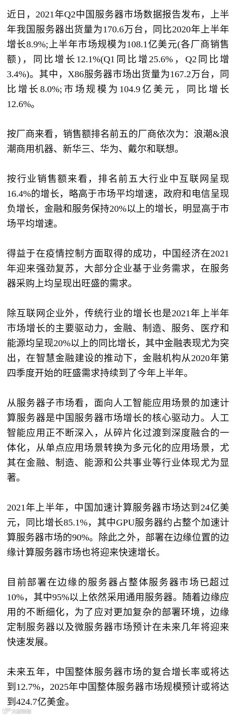 上半年我国服务器出货量为170.6万台,同比2020年上半年增长8.9%;上半年市场规模为108.1亿美元。