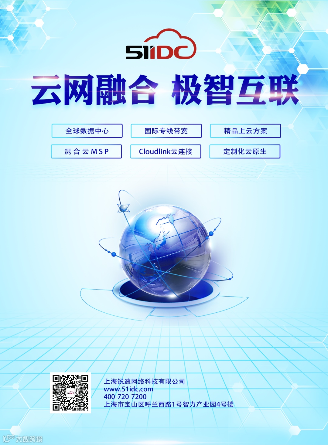 上海锐速网络科技有限公司(51IDC)是安畅网络集团旗下全球卓越混合云集成服务商,我们提供数据中心服务的同时,也致力于云计算领域的部署和落地能力。全行业的智选方案,极简可靠的交付方式,多场景的连接能力,高效专业的技术支撑,打通跨地域,跨终端,跨生态的连接,为各类业务构建灵活IT架构。