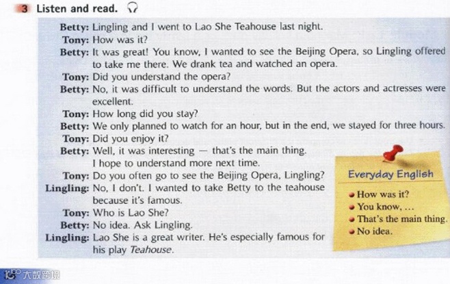 Listen and read.听一听,读一读。Betty: Lingling and I went to Lao She Teahouse last night.贝蒂:昨晚我和玲玲去了老舍茶馆。Tony: How was it?托尼:那儿怎么样?Betty: It was great! You know, I wanted to see the Beijing Opera, so Lingling offered to take me there. We drank tea and watched an opera.贝蒂:非常好!你知道,我想看京剧,因此玲玲提议带我去那儿。我们喝了荼,看了京剧。Tony: Did you understand the opera?托尼:你能看懂京剧吗?Betty: No, it was difficult to understand the words. But the actors and actresses were excellent.贝蒂:看不懂,很难听懂唱词。但是男女演员都很出色。Tony: How long did you stay?托尼:你们待了多长时间?Betty: We only planned to watch for an hour, but in the end, we stayed for three hours.贝蒂:我们本来计划只看一个小时,但最后我们待了三个小时。Tony: Did you enjoy it?托尼:你喜欢它吗?Betty:Well,it was interesting-that's the main thing. I hope to understand more next time.贝蒂:嗯,它很有趣——那是主要的事情。我希望下次能懂得多一些。Tony: Do you often go to see the Beijing Opera, Lingling?托尼:玲玲,你经常去看京剧吗?Lingling: No,I don't. I wanted to take Betty to the teahouse because it's famous.玲玲:不,我不经常看。我想带贝蒂去(看看)茶馆,因为它很有名。Tony: Who is Lao She?托尼:老舍是谁?Betty: No idea. Ask Lingling.贝蒂:不知道。问问玲玲吧。Lingling: Lao She is a great writer. He's especially famous for his play Teahouse.玲玲:老舍是一位伟大的作家。他尤其以他的话剧《茶馆》而出名。 A5