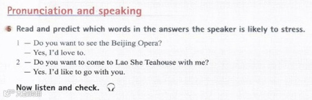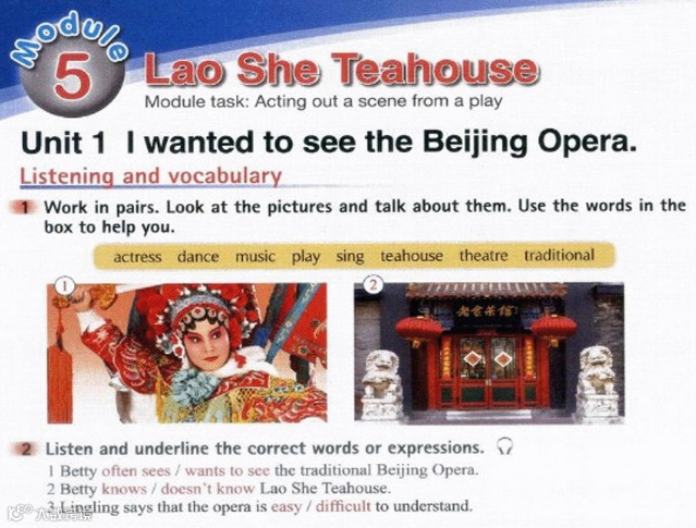 2 Listen and underline the correct words or expressions.Lingling: Hi, Betty. Betty: Hi, Lingling. I’d like to see the traditional Beijing Opera. Lingling: Do you want to come to Lao She Teahouse with me?Betty: What’s Lao She Teahouse?Lingling: You can listen to the Beijing Opera there and drink tea at the same time. Betty: Yes, please. I’d like to go with you. You can tell me what’s happening. Lingling: Yes, it’s quite difficult to understand the story! Just watch the actors and actresses, listen to the music and try to enjoy it.听录音并在正确的单词或短语下面画线。玲玲:你好,贝蒂。贝蒂:你好,玲玲。我想去看传统的京剧。玲玲:你想和我一块来老舍茶馆吗?贝蒂:老舍茶馆是什么?玲玲:你可以在那儿边听京剧边喝茶。贝蒂:好的。我想和你一块去。你可以告诉我怎么回事。玲玲:是的,理解那个故事是相当难的!只要观看那些男女演员,听音乐并尽力欣赏就行了。1. Betty often sees/wants to see the traditional Beijing Opera.贝蒂经常看/想看传统京剧。2. Betty knows/doesn't know Lao She Teahouse.贝蒂知道/不知道老舍茶馆。3. Lingling says that the opera is easy/difficult to understand.玲玲说戏剧很容易/难理解。 Unit 1 A3动画视频