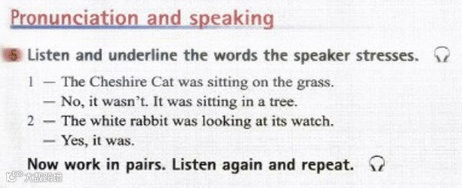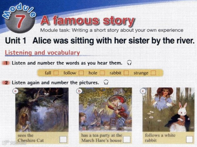 1 Listen and number the words as you hear them.Alice’s Adventures in Wonderland is a famous English story. It’s about a girl called Alice. She goes to Wonderland and meets some strange people and animals. First, she follows a white rabbit and falls down a hole. Then, she sees the Cheshire Cat. She goes to a tea party at the March Hare’s house. Finally, she meets the Queen of Hearts. 听录音,给你所听到的单词标上序号。《爱丽丝漫游奇境记》是一个著名的英国故事。它是关于一个叫爱丽丝的女孩的(故事)。她去了一个奇妙的地方并遇到了一些奇怪的人和动物。首先,她跟着一只白色的兔子并掉进了一个洞里。然后,她看见了柴郡猫。她参加了三月兔家的一个茶会。最后,她遇到了红桃王后。 Listen again and number the pictures.再听一遍录音,给下列图片编号。