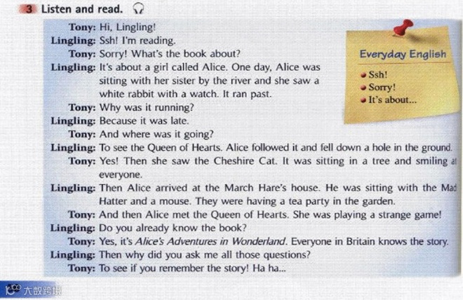 Listen and read.听一听,读一读。Tony: Hi, Lingling!托尼:嗨,玲玲!Lingling: Ssh! I'm reading.玲玲:嘘!我在看书。Tony: Sorry! What's the book about?托尼:对不起!是本什么书?Lingling: It's about a girl called Alice. One day, Alice was sitting with her sister by the river and she saw a white rabbit with a watch.olt ran past.玲玲:是关于一个叫爱丽丝的女孩的故事。有一天,爱丽丝正和她姐姐坐在河边,她看到一只戴着手表的白兔从旁边跑了过去。Tony: Why was it running?托尼:它为什么跑?Lingling:Because it was late.玲玲:因为它迟到了。Tony: And where was it going?托尼:它要去哪儿?Lingling:To see the Queen of Hearts. Alice followed it and fell down a hole in the ground.玲玲:去见红桃l后。爱丽丝跟着它,掉进了地上的一个洞里。Tony: Yes!Then she saw the Cheshire Cat. It was sitting in a tree and smiling at everbrone.托尼:是的!然后她看到了柴郡猫。它正坐在树上,朝大家微笑。Lingling: Then Alice arrived at the March Hare's house. He was sitting with the Mad Hatter and a mouse. They were having a tea party in the garden.玲玲:然后爱丽丝到了三月兔家,他正同疯帽匠和一只老鼠坐在一起。他们正在花园里开茶会。Tony: And then Alice met the Queen of Hearts. She was playing a strange game!托尼:然后爱丽丝遇到了红桃王后。她正在玩一种奇怪的游戏!Lingling: Do you already know the book?玲玲:你旱已知道这本书了吗?Tony: Yes, it's Alice's Adventures in Wonderland. Everyone in Britain knows the story.托尼:是的,这本书是《爱丽丝漫游奇境记》。在英国,人人都知道这个故事。Lingling: Then why did you ask me all those questions?玲玲:那你为什么问我所有那些问题?Tony: To see if you remember the story! Ha ha...托尼:看看你是否记得这个故事!哈哈……