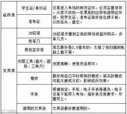 1)准备好第二天考试用的物品、笔盒(不要杂物、去掉有字的纸片、2B铅笔)、塑料软橡皮、圆规(带2B铅笔)、三角尺、垫板等。准备好雨伞备用。准备好手表以便考试备用。
