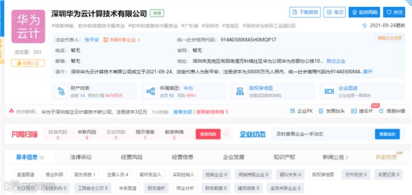 近日,据了解,深圳华为云计算技术有限公司已经成立,经营范围包括云计算装备技术服务;云计算设备制造;信息网络传播视听节目;互联网域名注册服务等。