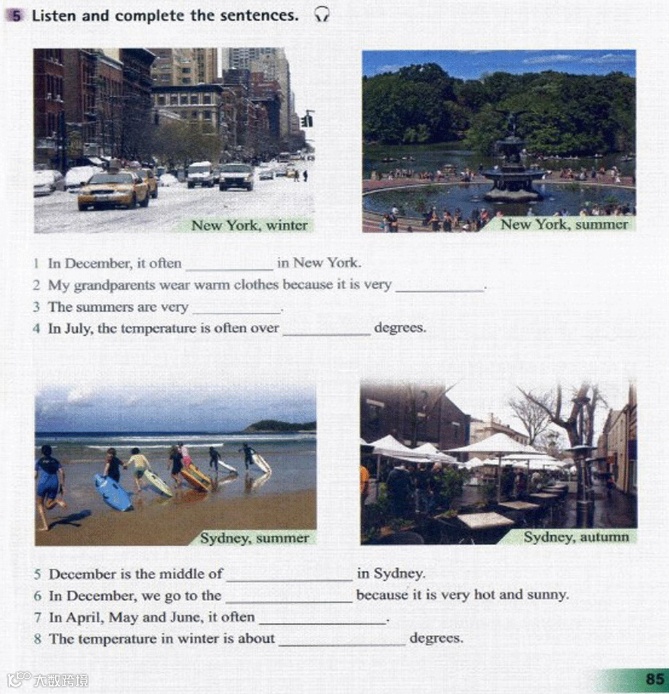Listen and complete the sentences.听录音并完成句子。My name is Peter and I live in Sydney, Australia, with my parents. My grandparents are American and they live in New York. The weather is very different there! In New York, it often snows in the winter months—December, January and February. My grandparents wear very warm clothes because it’s very cold. In New York, the summers are very hot. In July, the temperature is often over thirty degrees. It never snows in Sydney in December because it’s the middle of summer. It’s very hot and sunny, so we often go to the beach! In Sydney, it often rains in the Australian autumn—April, May and June. Winter in Sydney is not very cold. The temperature is about eighteen degrees.我的名字叫彼得,和我的父母住在澳大利亚的悉尼。我的祖父母是美国人,他们住在纽约。那儿的天气是很不同的!在纽约,冬季月份(十二月、一月和二月)经常下雪。我的祖父母穿很暖和的衣服,因为天很冷。在纽约,夏季很热。在七月,温度经常超过30度。在悉尼,十二月从不下雪,因为正处于夏季中期。天气很热很晴朗,所以我们经常去海滩!在悉尼,在澳大利亚的秋季(四月、五月和六月),天经常下雨。悉尼的冬季不是很冷。温度大约在18度。