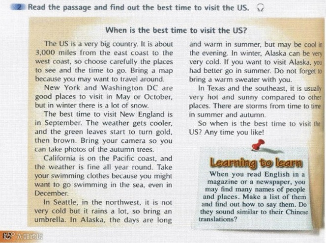 Read the passage and find out the best time to visit the US.读短文,找出游览美国的最佳时间。When is the best time to visit the US?游览美国的最佳时间是什么时候?The US is a very big country. It is about 3,000 miles from the east coast to the west coast, so choose carefully the places to see and the time to go. Bring a map because you may want to travel around.美国是一个很大的国家。从东海岸到西海岸大约有三千英里,因此要认真选择去看的地方和去的时间。带上一张地图,因为你可能想要到处走一走。New York and Washington DC are good places to visit in May or October, but in winter there is a lot of snow.纽约和华盛顿特区是五月或十月游览的好地方,但是在冬季(两地)下雪很多。The best time to ,Asit New England is in September. The weather gets cooler, and the green leaves start to turn gold, then brown. Bring your camera so you can take photos of the autumn trees.九月是游览新英格兰的最佳时间。天气变得比较凉爽,绿色的树叶开始变成金黄色,然后变成褐色。带上你的相机,这样就可以拍摄秋天的树木了。California is on the Pacific coast, and the weather is fine all year round. Take your swimming clothes because you might want to go swimming in the sea, even in December.如利福尼亚位于太平洋沿岸,那里的天气常年很好。带上你的泳衣,因为甚至在十二月,你也可能想要去海里游泳。In Seattle, in the northwest ,it is not very cold but it rains a lot, so bring an umbrella. In Alaska, the days are long and warm in summer,but may be coo! in the evening.In winter,Alaska can be very very cold. If you want to visit Alaska,you had better go in summer. Do not forget to bring a warm sweater with you..位于美国西北部的西雅图,天气不是很冷,但经常下雨,所以要带上一把雨伞。在阿拉斯加,夏季白天长而温暖,但在晚上可能会有点儿凉。在冬季,阿拉斯加可能非常非常寒冷。如果你想去游览阿拉斯加,你最好在夏天去。不要忘记随身蒂上一件暖和的毛衣。In Texas and the southeast,it is usually very hot and sunny compared to other places. There are storms from time to time in summer and autumn.与其他地方相比,德克萨斯州和东南部地区通常天气非常炎热,阳光灿烂。在夏季和秋季时常有暴风雨。So when is the best time to visit the US? Any time you like!所以游览美国的最佳时间是什么时候?你喜欢的任何时候都行!