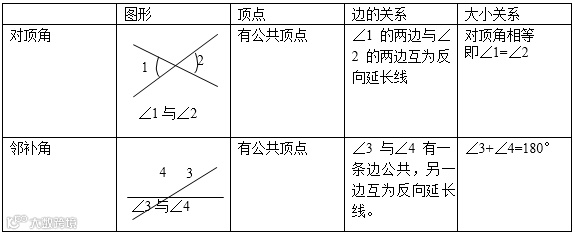⑶两直线相交形成的四个角中,每一个角的邻补角有两个,而对顶角只有一个。