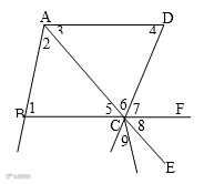 如图,判断下列各对角的位置关系:⑴∠1 与∠2;⑵∠1 与∠7;⑶∠1 与∠BAD;⑷∠2与∠6;⑸∠5 与∠8。