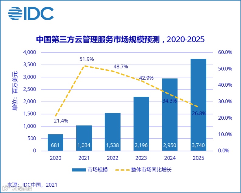 中国第三方云管理服务在2020年到2025年间将保持40.6%的复合增长率,2025年市场规模预计达到37.4亿美元。