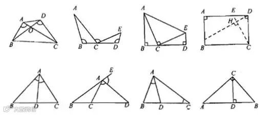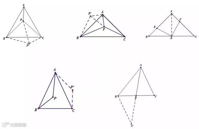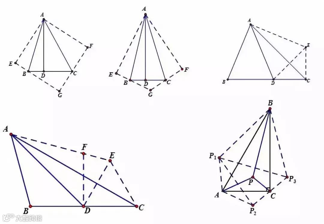 上图依次是45°、30°、22.5°、15°及有一个角是30°直角三角形的对称(翻折),翻折成正方形或者等腰直角三角形、等边三角形、对称全等。