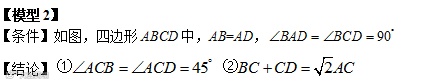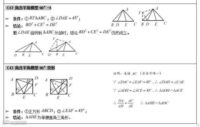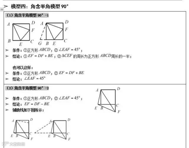 旋转半角的特征是相邻等线段所成角含一个二分之一角,通过旋转将另外两个和为二分之一的角拼接在一起,成对称全等。