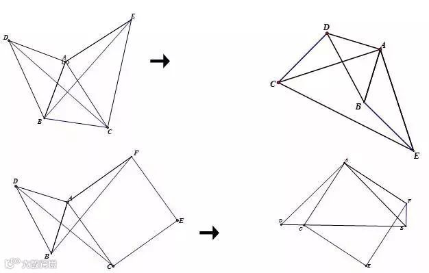 当遇到复杂图形找不到旋转全等时,先找两个正多边形或者等腰三角形的公共顶点,围绕公共顶点找到两组相邻等线段,分组组成三角形证全等。