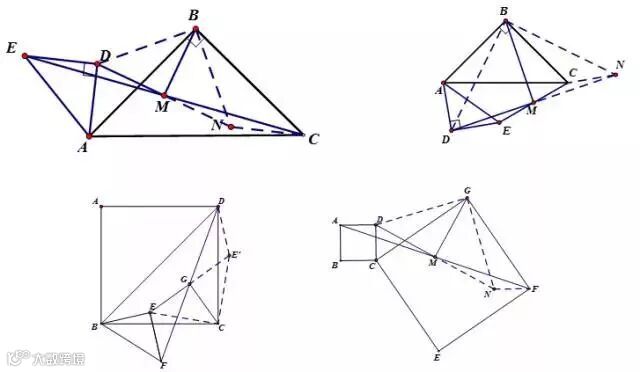 两个正方形、两个等腰直角三角形或者一个正方形一个等腰直角三角形及两个图形顶点连线的中点,证明另外两个顶点与中点所成图形为等腰直角三角形。证明方法是倍长所要证等腰直角三角形的一直角边,转化成要证明的等腰直角三角形和已知的等腰直角三角形(或者正方形)公旋转顶点,通过证明旋转全等三角形证明倍长后的大三角形为等腰直角三角形从而得证。