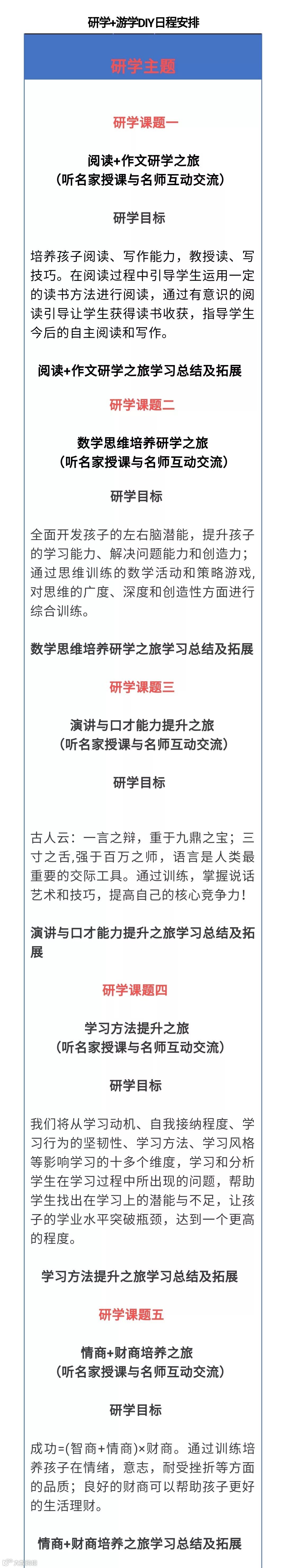 本次夏令营主题研学与主题游学自由搭配,把教育功能镶嵌在旅行过程中的每一个环节,最大限度满足孩子的不同成长需求。主题研学中含有专家讲座、交流、互动式的体验教学等教育活动,强调人文素养与学习发展能力两大最具竞争力品质的培养。我们即反对“纯玩”夏令营,也反对“纯学”夏令营。因为这都剥夺了孩子有意义的童年。