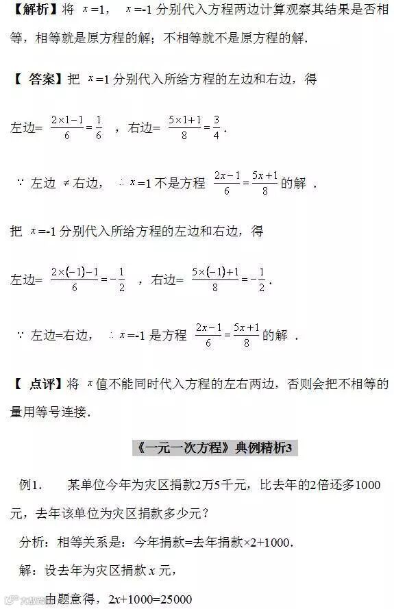 ⑵ 方程的解的检验方法,首先把未知数的值分别代入方程的左、右两边计算它们的值,其次比较两边的值是否相等从而得出结论。