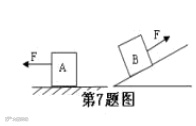 1、如图示,已知物体A 和 B 质量相等,A 在粗糙的水平地面,B在光滑的斜面。现它们分别在同样大小的力F作用下沿F的方向分别移动了距离S,则F对物体做的功()