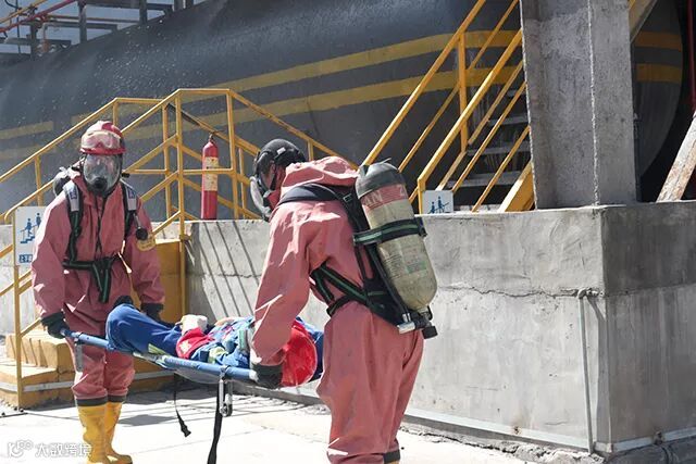 本次演练,模拟脱硫运行人员在液氨1号储罐操作过程中,阀门法兰处突然泄漏,大量氨气漏出,导致人员中毒晕倒在操作平台,警报响起后,运行人员借助现场防护服和正压式呼吸器第一时间救出晕倒同事。
