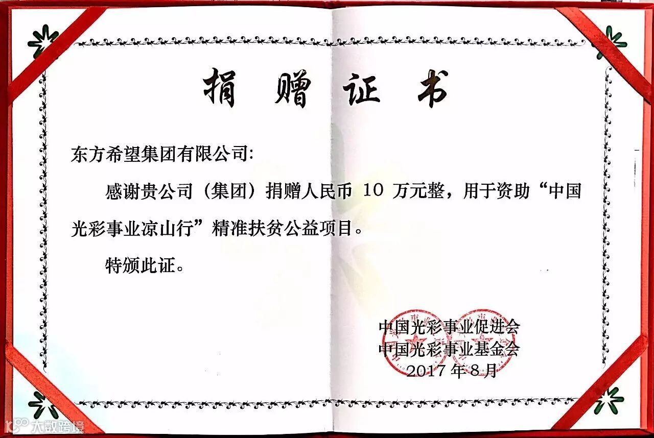 为凉山州脱贫攻坚助一臂之力,东方希望集团向中国光彩事业促进会、中国光彩事业基金会捐赠人民币10万元整,用于资助“中国光彩事业凉山行”精准扶贫公益项目。