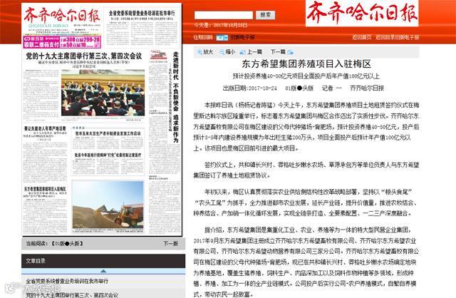10月23日,东方希望集团养殖项目土地租赁签约仪式在梅里斯达斡尔族区隆重举行,标志着东方希望集团与梅区合作迈出了实质性步伐。