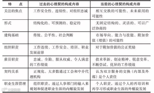 近年来,在全球竞争和组织变革的大背景下,心理契约在内容上发生了巨大的变化。过去在心理契约中非常重要的内容,正在逐渐消失或占据次要地位。同时,一些新的内容,如对灵活性、公平性、变革创新、不断尝试的要求,在心理契约中占据的权重越来越大,下图表概括了这些成果。