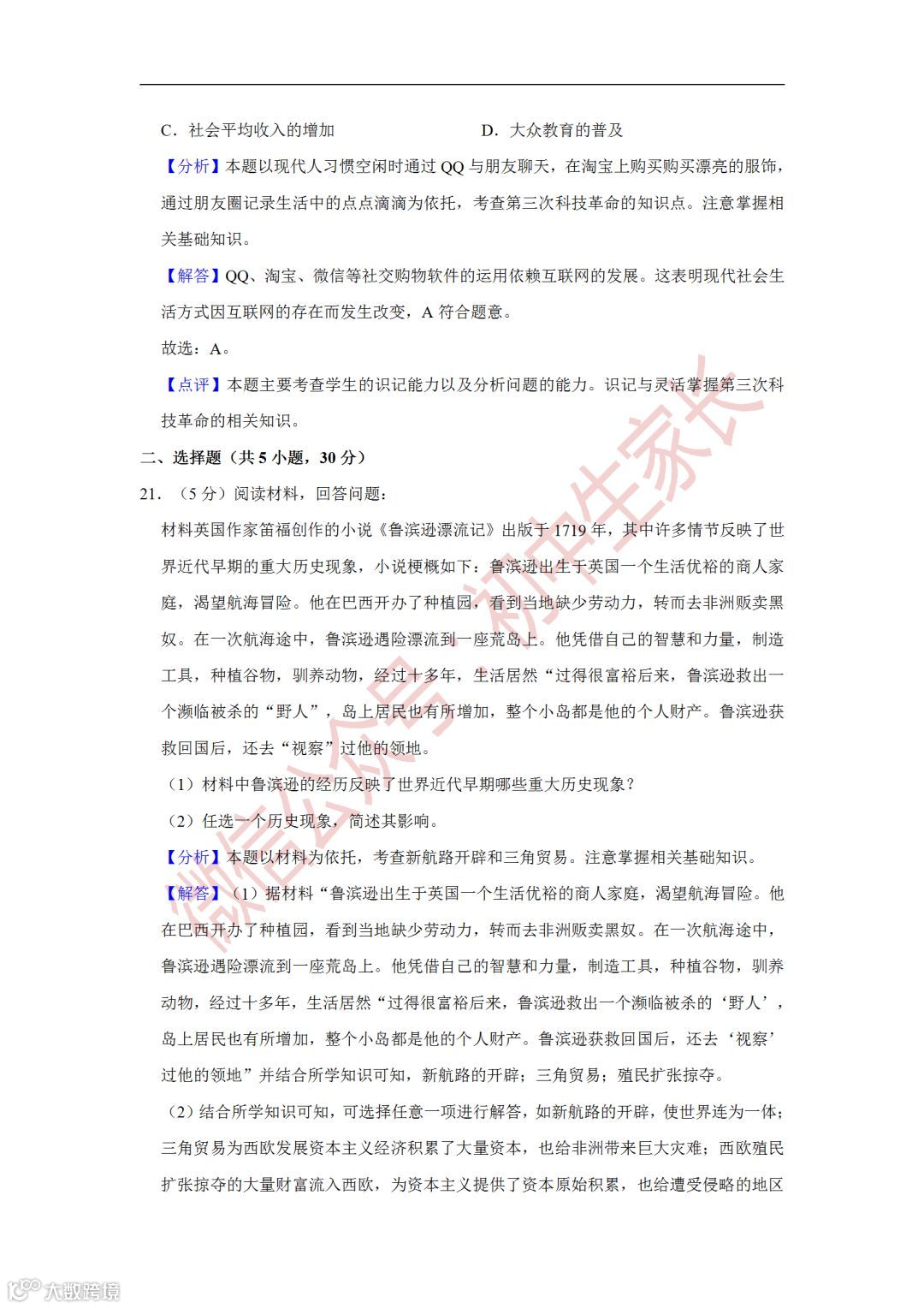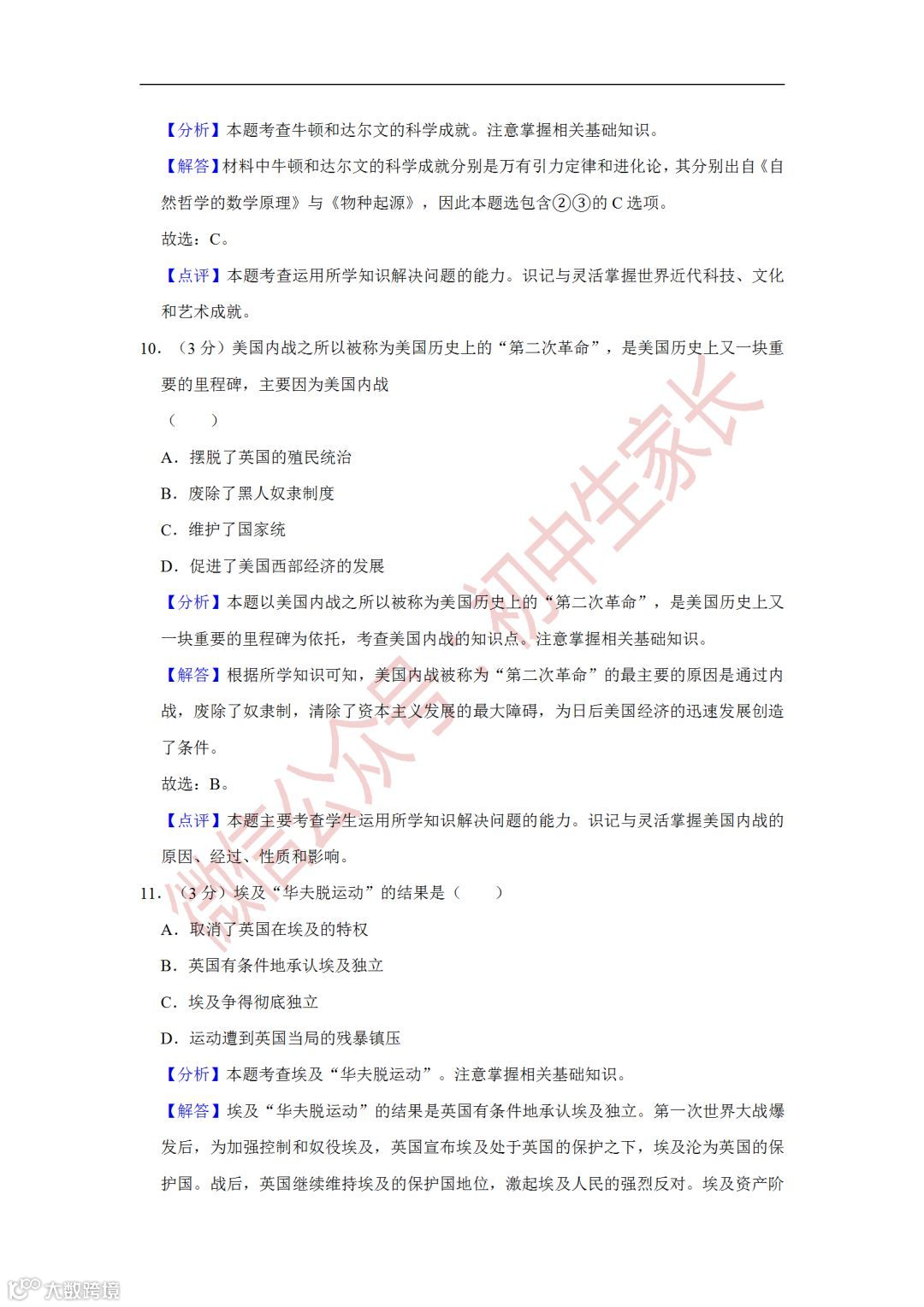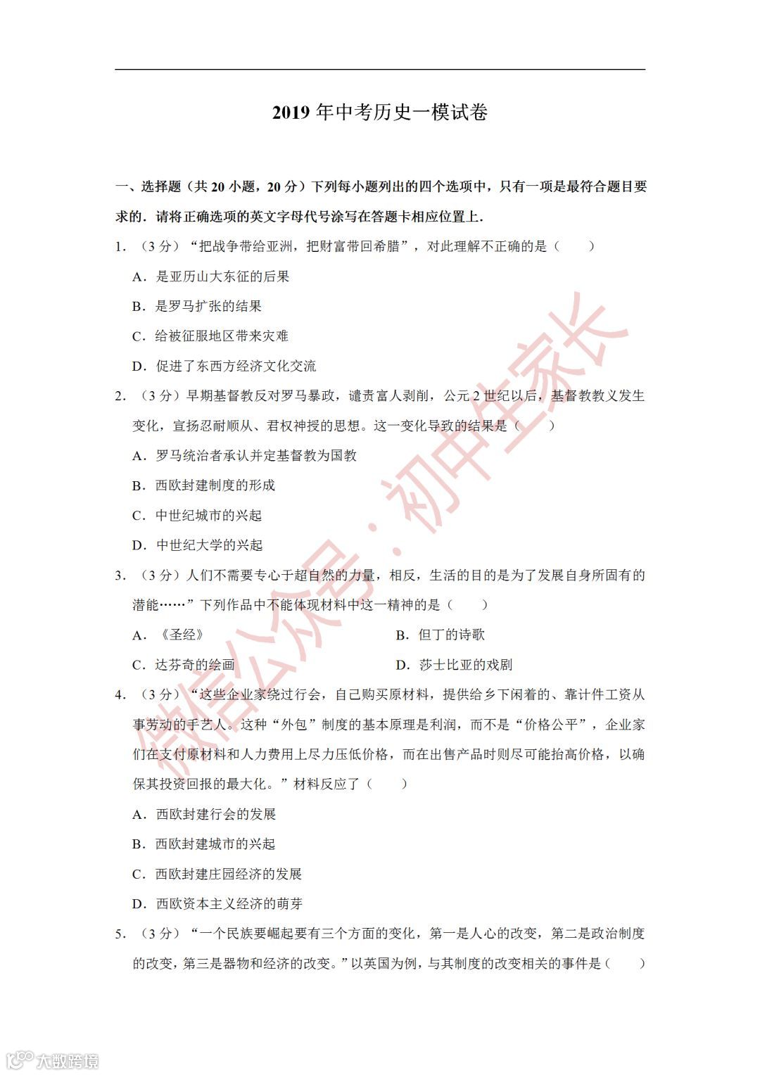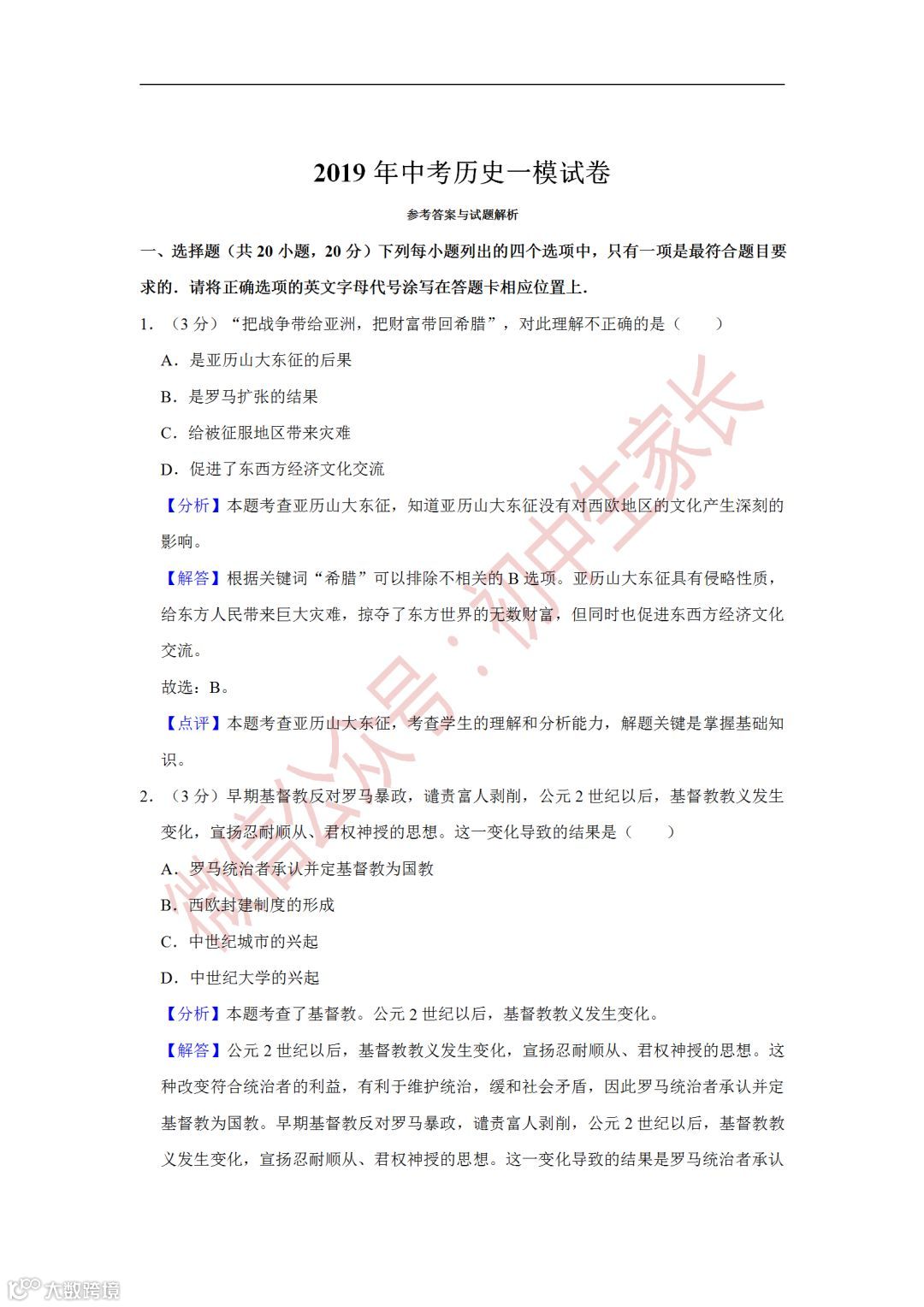 2019年中考历史一模试卷,附答案解析