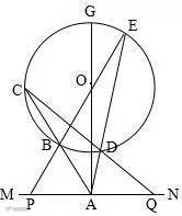 2、设MN是圆O外一直线,过O作OA⊥MN于A,自A引圆的两条直线,交圆于B、C及D、E,直线EB及CD分别交MN于P、Q.
