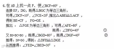 4、如图,△ABC中,∠ABC=∠ACB=80度,D、E分别是AB、AC上的点,∠DCA=30度,∠EBA=20度,求∠BED的度数.