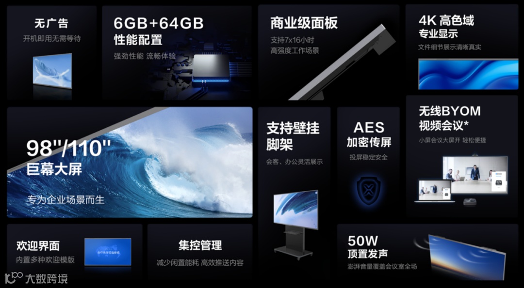 * 超薄设计 & 便捷安装:简约纤薄机身设计,节省空间;提供标准VESA壁挂接口,安装灵活便捷,轻松融入各类会议室环境。