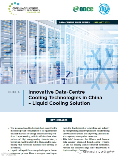 日前,ODCC(开放数据中心委员会)联合UDP(联合国环境规划署-丹麦科技大学合作伙伴)哥本哈根能源效率中心、ITU(国际电信联盟)在全球联合发布题为《Innovative Data-CentreCooling Technologies in China-Liquid Cooling Solution》的液冷研究报告,介绍液冷技术在中国数据中心的发展与实践。