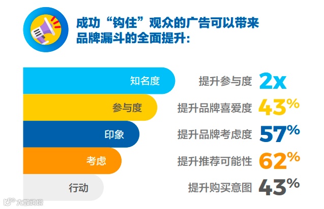 一个强有力的“钩子”可以对品牌知名度产生积极影响。特别是,在此期间,在顶部中心展示品牌标志的广告,可以增加24%的品牌知名度。