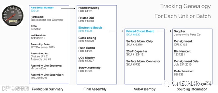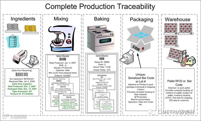 By analogy, let’s look at an intuitive example: a commercial cake baking enterprise. Even for a relatively simple (compared to semiconductor manufacturing) production process, full traceability requires information from the raw materials suppliers through the manufacturing process to packaging and finished goods warehousing. You can see in the picture below that material, recipe, and equipment setup information is included in the records produced.