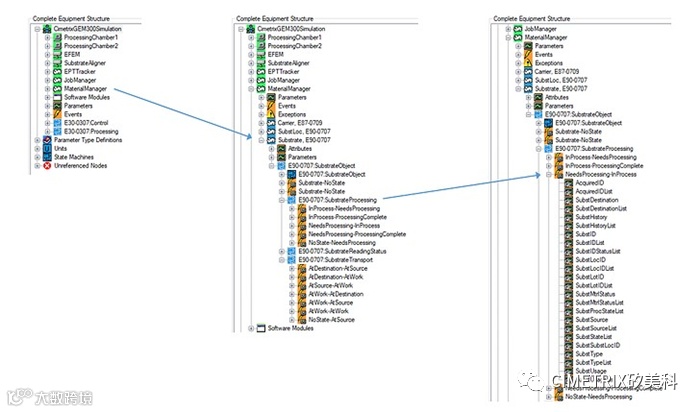 In a unit of semiconductor manufacturing equipment with an E164-compliant interface, these types of information appearin various sections of the equipment metadata model. Specifically, material-related information is captured in the “Material Manager” logical component, shown in expanded view below* to highlight the state transition events and parameter data available for each substrate during its transportation and processing in the equipment.