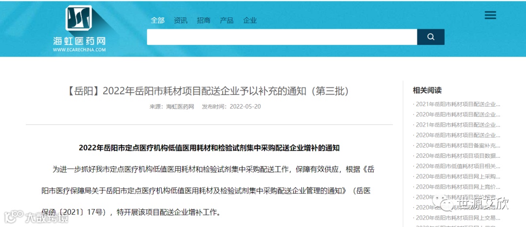 2022年岳阳市定点医疗机构低值医用耗材和检验试剂集中采购配送企业增补的通知