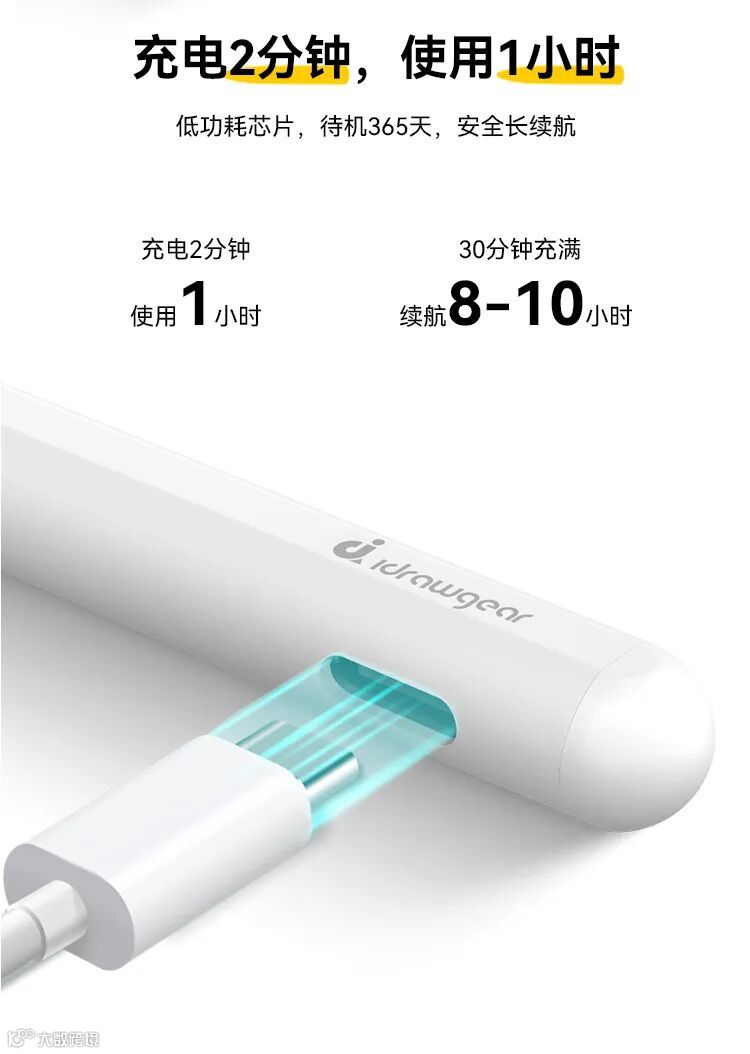 这款电容笔可以实现:充电2分钟,使用1小时。