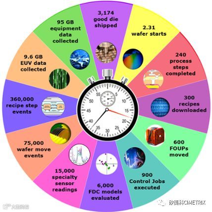 With the advent of 300mm manufacturing in the mid-to-late 90s, a global team of volunteer system engineers from the leading chip makers defined the GEM300 standards to support fully automated manufacturing operations. Starting at 5:00 o’clock on the infographic, the number of transactions per minute jumps almost 3 orders of magnitude, from the monitoring of 900 control jobs across 4000 process tools to the tracking of 360,000 individual recipe step change events. This level of event granularity is essential for the latest generation of FDC (Fault Detection and Classification) applications, because precise data framing is a key prerequisite for minimizing the false alarm rate while still preventing serious process excursions. In this context, more than 6000 recipe-, product- and chamber-specific fault models may be evaluated every minute.