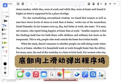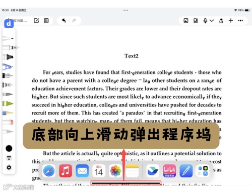 打开一个软件后,在底部向上滑动弹出程序坞,在程序坞内拖动想要分屏的软件到屏幕的左侧(或右侧)。