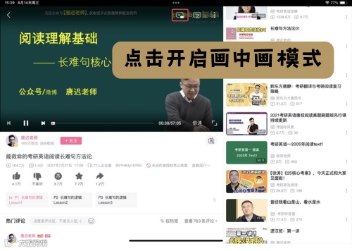 打开视频软件后,点击开启画中画模式,打开另一个需要使用的软件。画中画模式可以随意拖动视频位置,双指捏合即可缩放视频大小。