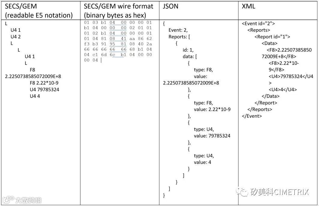 Take a typical GEM interface that uses unsigned 4-byte integers for IDs and an event report containing 8-byte floating point numbers and 4-byte integers. An example of this message is shown in the table below in a SECS/GEM format per E5 and in equivalent JSON and XML formats.