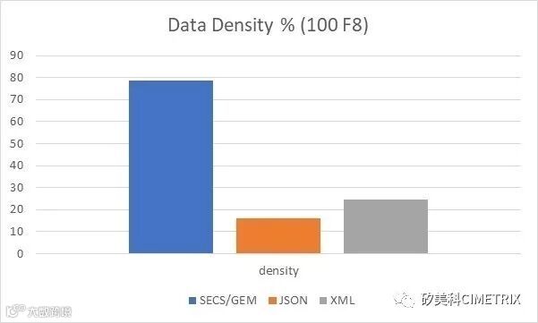 现在,如果我们将示例消息更改为包含100个8字节浮点数,则数据密度百分比图将改变为如下图。注意JSON和XML相对相同,但是SECS/GEM数据密度增加到78%。数据密度百分比由(实际数据)/开销*100计算。