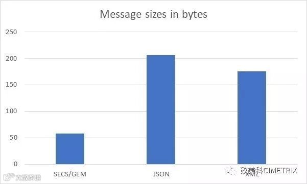 二进制SECS/GEM消息将通过网络占用58个字节,JSON大约占用206个字节,XML 175占用175个字节。JSON和XML数字可以根据键/元素名称进行一些更改,上面的只是许多可能的表示之一。