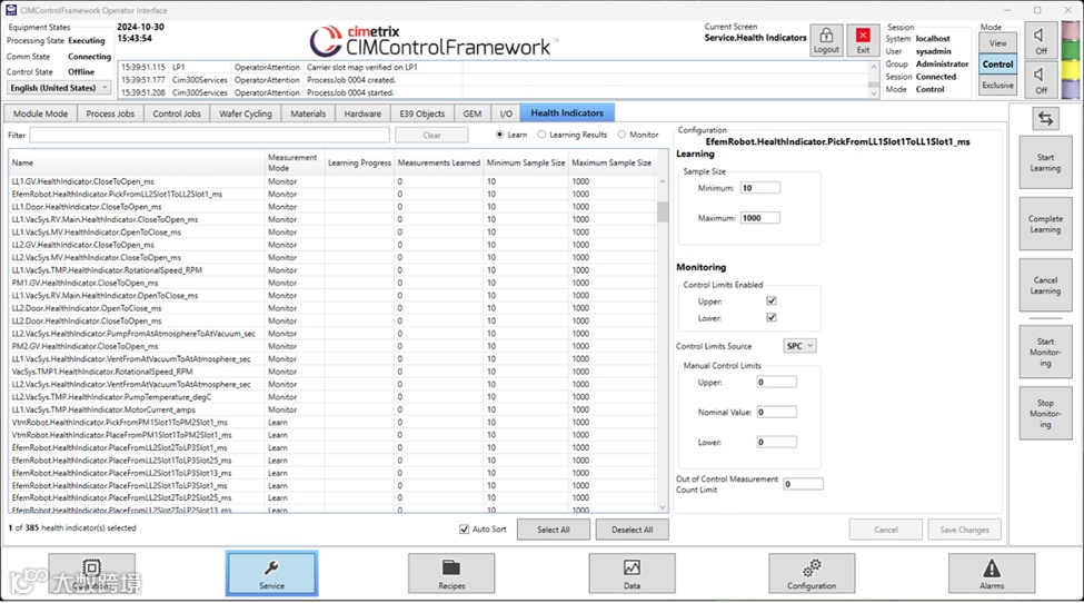 通过与设备硬件对接并发布数据,CCF 具备了监控设备性能的独特优势。其“健康指标(HealthIndicators)” 功能将统计过程控制(SPC)与功能强大、操作直观的图形化界面(GUI)管理工具相结合,可实现对设备的全面监控。借助 CCF 健康指标功能,企业能够提前开展预防性维护、及早发现潜在问题,从而有效降低维护成本。