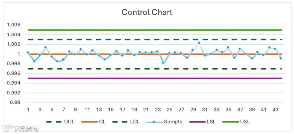 以之前的零件生产为例:假设零件长度均值为 1.000,上控制限(UCL)为 1.003,下控制限(LCL)为 0.997;而设计标称长度为 1.000,公差为 ±0.005,那么上规格限(USL)即为 1.005,下规格限(LSL)为 0.995。此时计算得出的过程能力指数(Process Capability Index,简称 Cpk)为 1.67,表明该过程 “具备能力”,产出通常能符合规格要求。