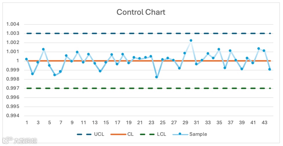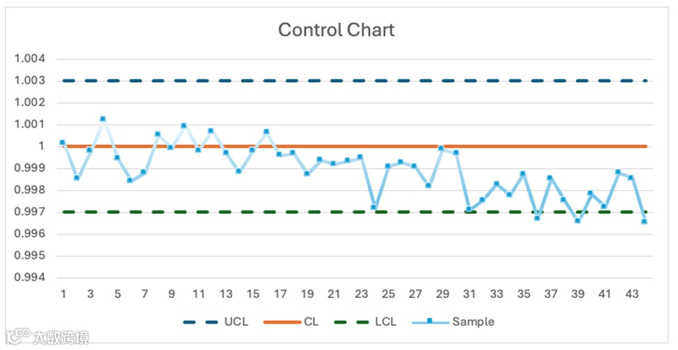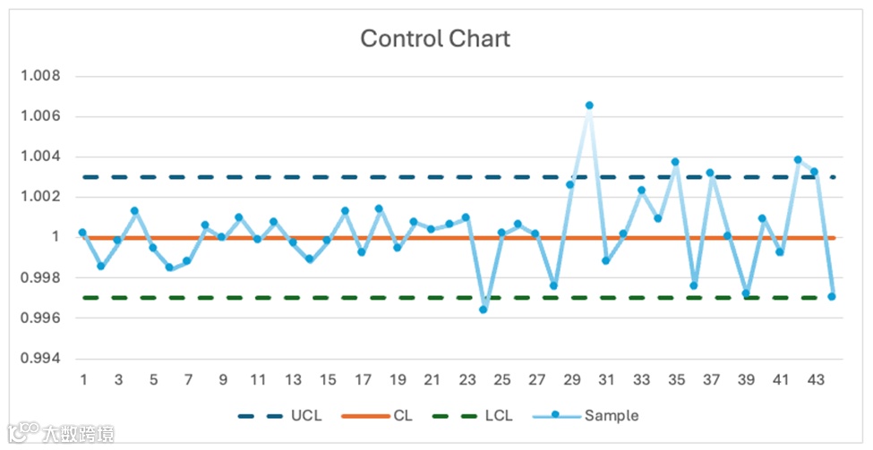 当收集到新的样本测量数据后,会将其绘制在过程控制图上,并与控制限进行比对:若样本测量值处于 UCL 与 LCL 之间,则认为过程 “受控”,符合预期运行状态。此外,还可应用额外规则(如检测趋势、周期性波动,或多个连续数据点接近控制限等情况),以识别过程不稳定或潜在问题的早期迹象。