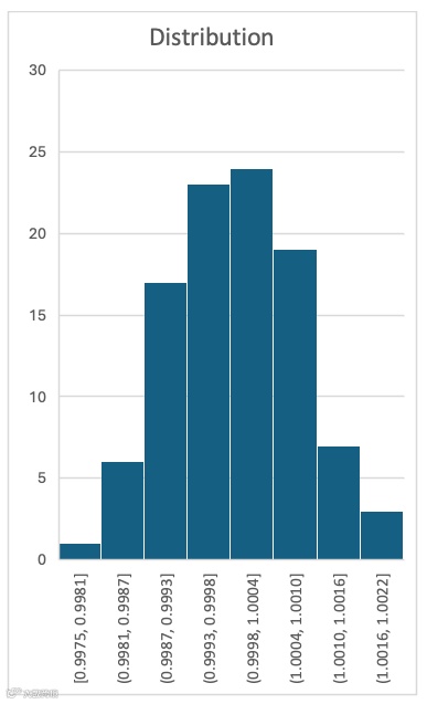 例如,若某生产过程制造的零件目标长度为 1 单位,且长度波动符合正态分布,那么测量 100 个零件并将数据绘制成直方图,得到的图表会如下所示: