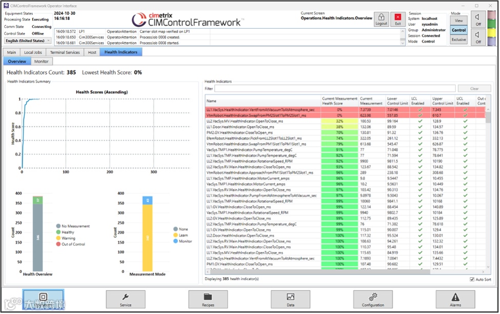 带有所有健康指标汇总视图的 CCF(Cimetrix CIM 控制框架)界面