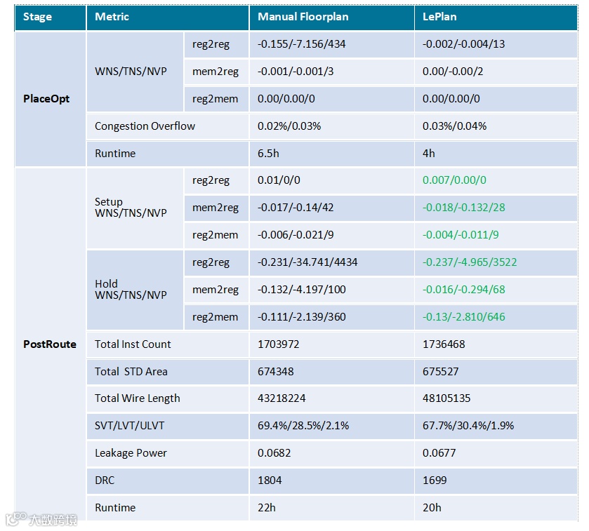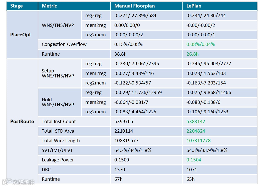 青芯半导体的技术专家以实例进一步说明,“对于我们某款12nm芯片的后端设计PPA,资深工程师经数轮反复迭代(含手工布图、布局和布线)的总耗时约4-6周(38个宏单元),而使用自动化工具LePlan 3小时不到就能完成布图规划,2天内完成其余后端设计流程,且时序结果较手工布图平均改善25%以上。另两款12nm芯片的后端设计更为复杂(分别有175个和305个宏单元),面对如此复杂且数量巨大的宏单元,即使是拥有10余年经验的资深后端设计工程师,仍需6-10周的反复迭代,才能逐步逼近目标PPA。我们使用LePlan经过两轮迭代,即实现时序和拥塞较手工布图平均30%以上的优化,在达成目标PPA的同时,总线长、标准单元面积、静态功耗等方面也表现出色。LePlan对于提升青芯后端团队的整体效率以及对年轻工程师的帮助是巨大的”。