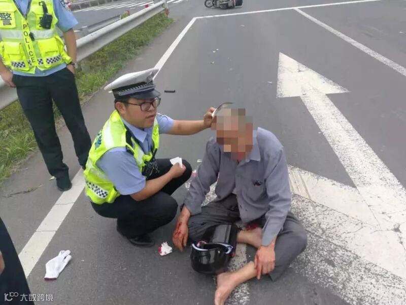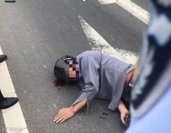 事故现场看着十分严重。交警赶到现场时发现陈大爷头上还牢牢戴着头盔,正因为这个头盔,在这么严重的撞击下陈大爷头部都没有受到重伤,没有生命危险,真是不幸中的万幸!