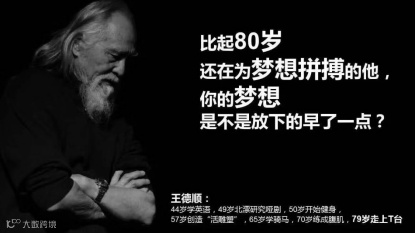 王德顺说:人的潜能是可以挖掘的,当你说太晚的时候,你一定要谨慎,它可能是你退却的借口,“没有谁能阻止你成功,除了你自己”。