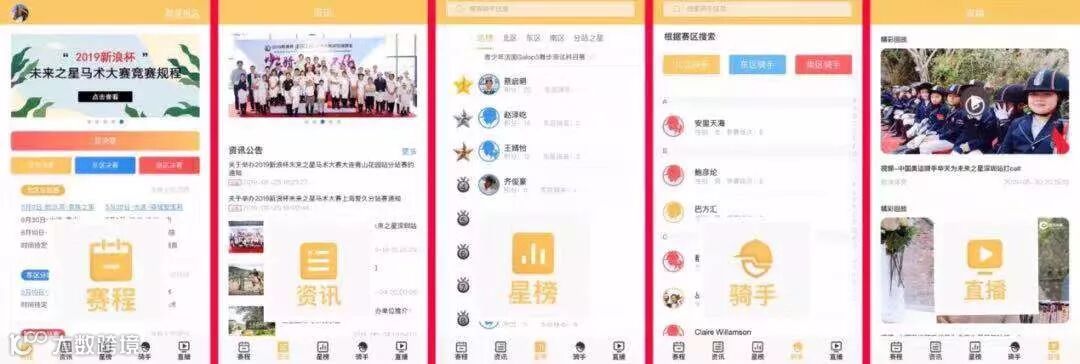 与此同时,未来之星马术大赛是中国大陆第一个拥有官方APP的马术赛事(苹果手机和安卓手机均可下载),在北京马协、新浪体育和游牧世界的共同努力下,历经半年的策划、设计和测试,最终成功上线。APP共有五栏目版块,分别是赛程、咨询、星榜、骑手和直播。打开APP点击下方各栏目按钮即可切换页面,查看赛程、资讯、积分榜、分站之星成绩信息以及精彩的赛事视频。